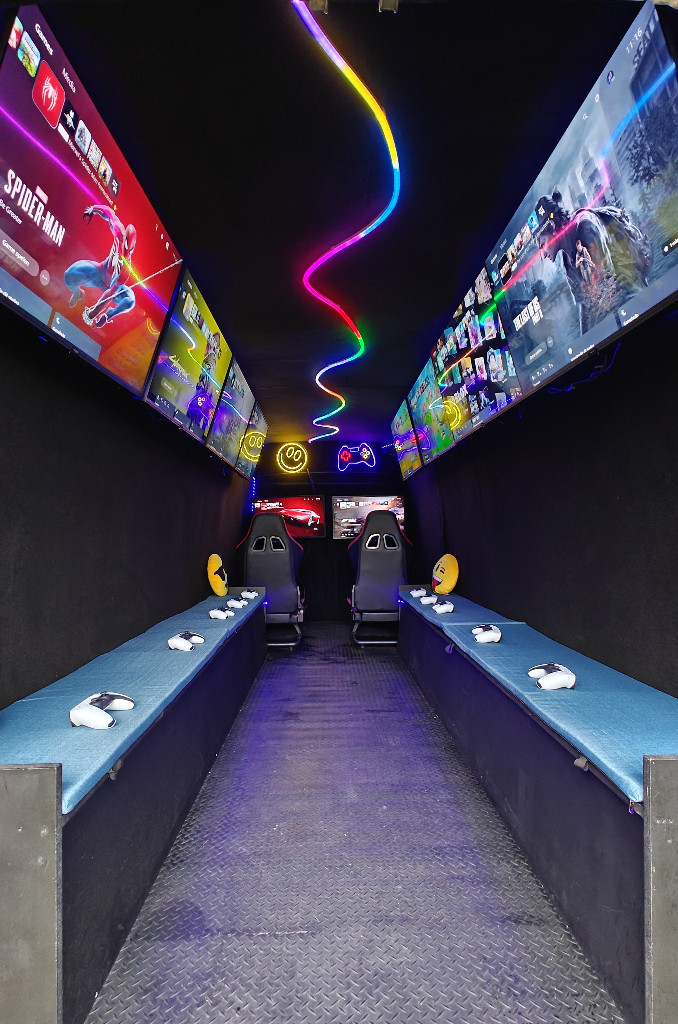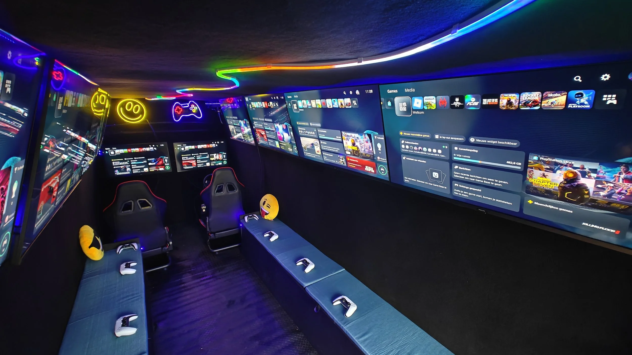 Een grote bestelwagen vol met spelconsoles, televisies en racestoelen.